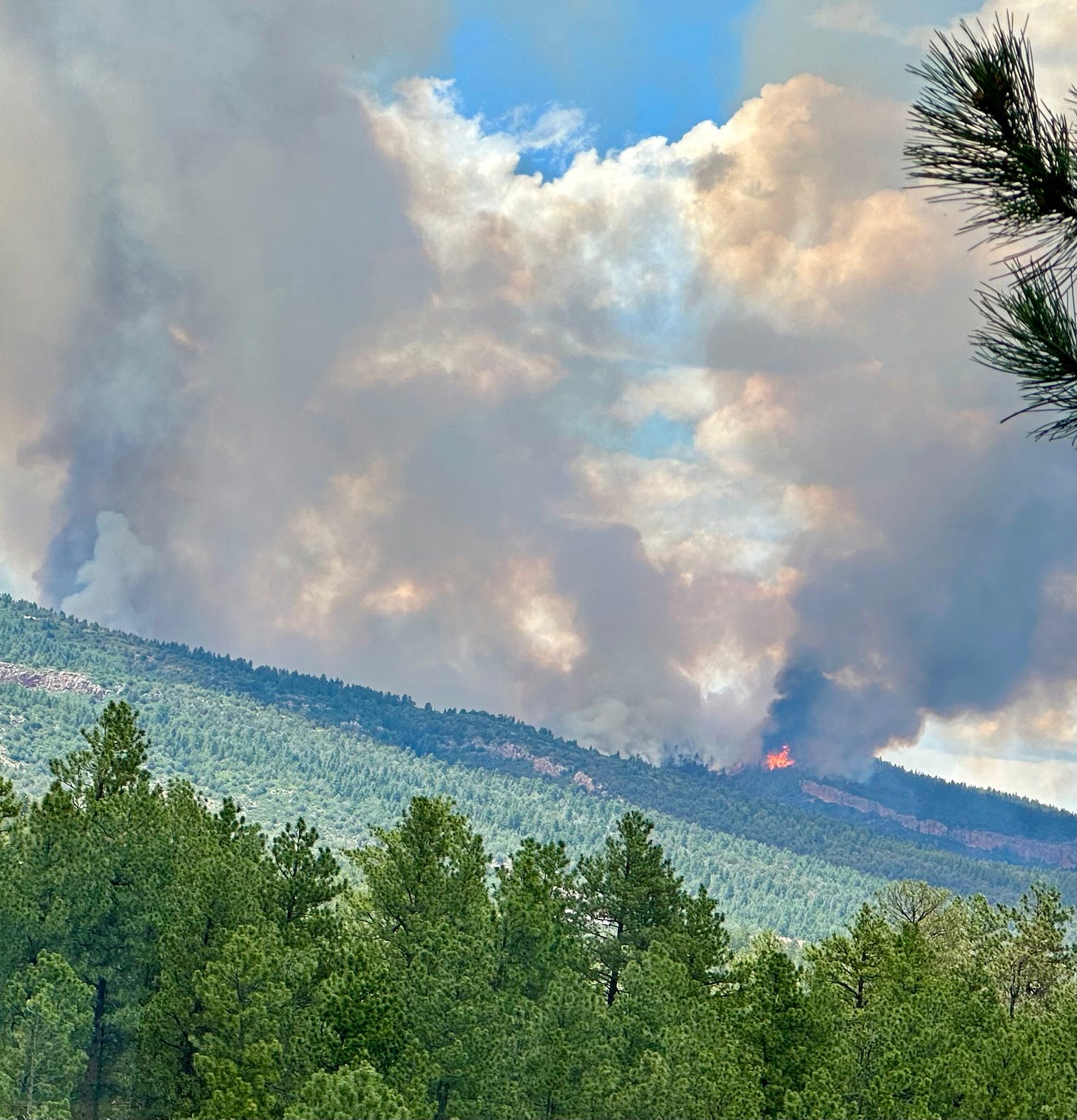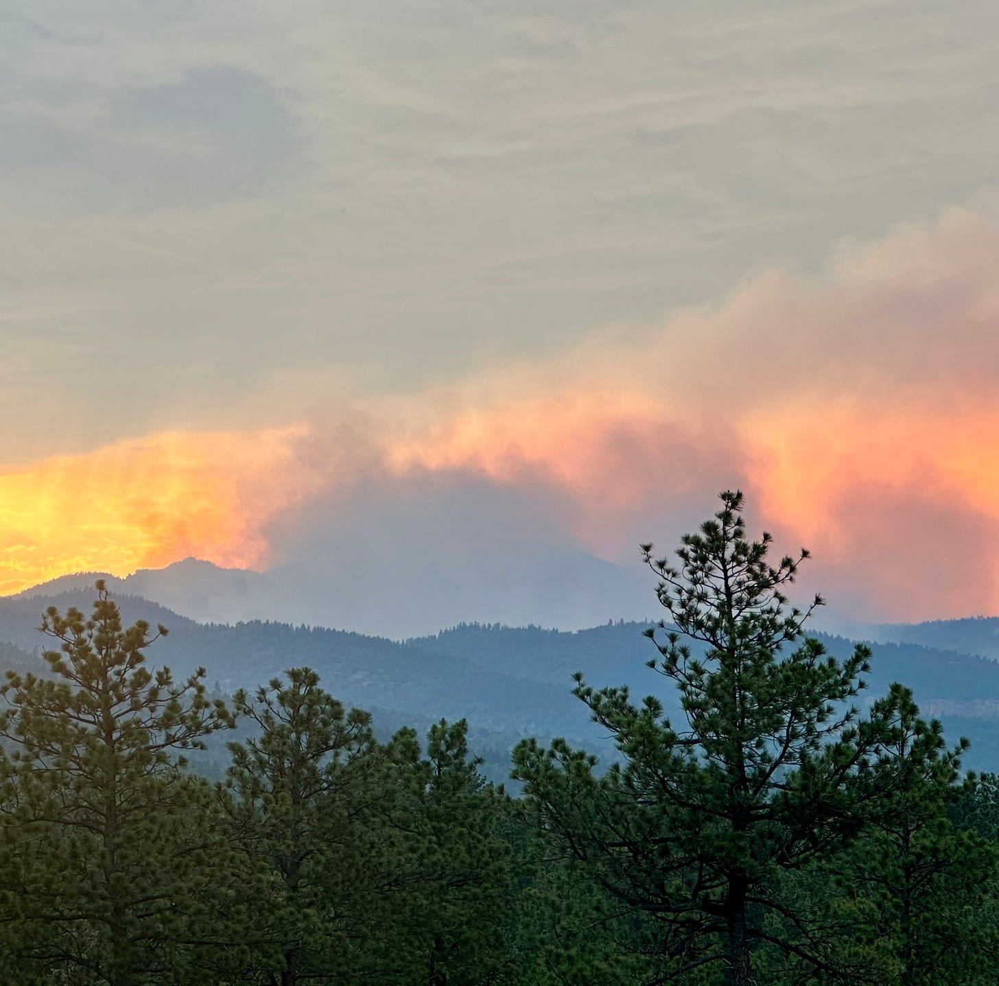 It is quiet today here at my little mountain home. This is usually how it is up here. But not so the last several days, when it sounded more like JFK airport. The noise was thanks to the Oak Ridge Fire, or, more precisely, the many aircraft employed to fight the fire. The 1200-acre wildfire’s southeast boundary is 2.8 miles from my house that sits on a west-facing hillside surrounded by a forest of ponderosa pines and Gambel oak (often referred to as scrub oak). From our deck, we have a front-row seat to the fire.